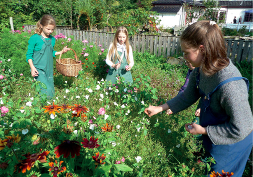 Snart, på en tørr og solrik dag, skal elevene få lov til å høste av denne blomsterprakten. Noen av blomstene har allerede blomstret ferdig og viser nå frem en liten krans av disse rare frøene som er så forskjellig i form og størrelse at det ville være umulig å så dem med en såmaskin. De modne frøene høster vi etter hvert til neste års bruk.