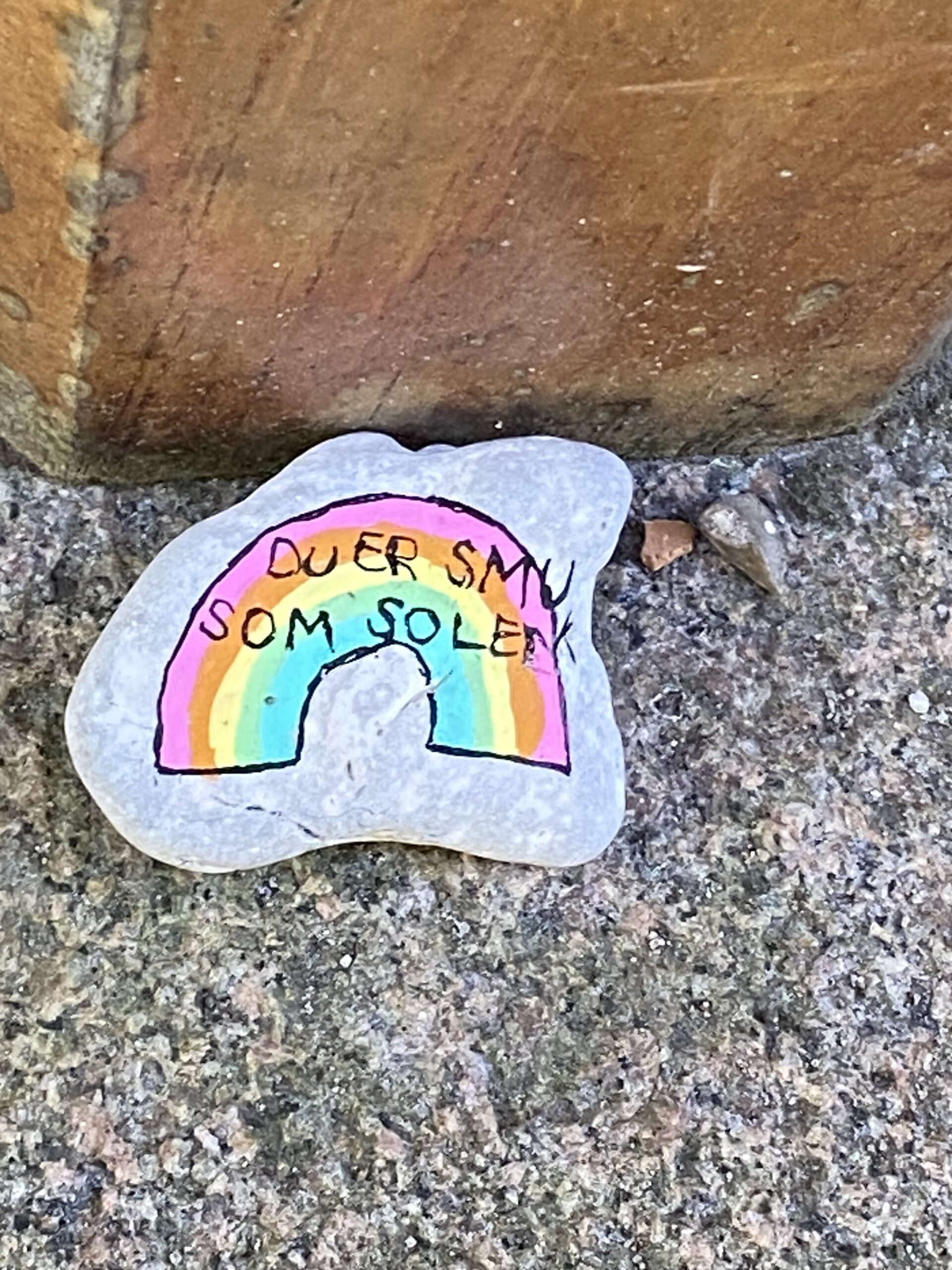 I år gik nogle ud og købte morgenmad, som de delte ud til hjemløse i byen. Andre lavede små sedler med opmuntrende ord, som de hængte op i overskolebygningen eller delte ud til fremmede på gaden. Nogle tog blomster med og gav dem væk til folk på gaden eller til ansatte på skolen – ledsaget af et smil. En gruppe samlede sten på stranden overfor skolen, malede dem med smukke mønstre og små budskaber og placerede dem diskret rundt omkring på overskolens grund, hvor andre tilfældigt kunne finde dem.
